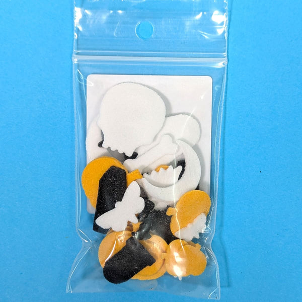 • Shapes: black cat, witch hat, bat, coffin, tombstone, bone, moth, ghost, skulls, and pumpkin