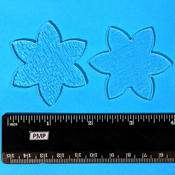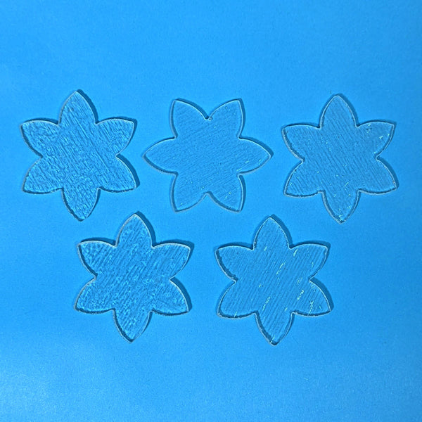 Our clear precut glass flowers are made from 3mm thick Bullseye glass and are 2" tall, and come in packs of 5, 10, and 25.